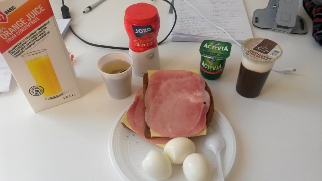 Kello on paikallista aikaa puoli kuusi ja olis aamutreenin vuoro, joka lähtee käyntiin lankuttamisella. Seuraavaksi selkää ja punnerruksia. Onneksi mulla on suhteellisen painava tuoli niin pystyn sitä myös hyvin hyödyntämään erilaisissa käsiliikkeissä. Treenit kun on treenailtu niin aamupalakin maistuu niin hyvältä! Kolme kananmunaa, pari leipää savukinkulla ja juustolla, jogurttia ja mysliä.