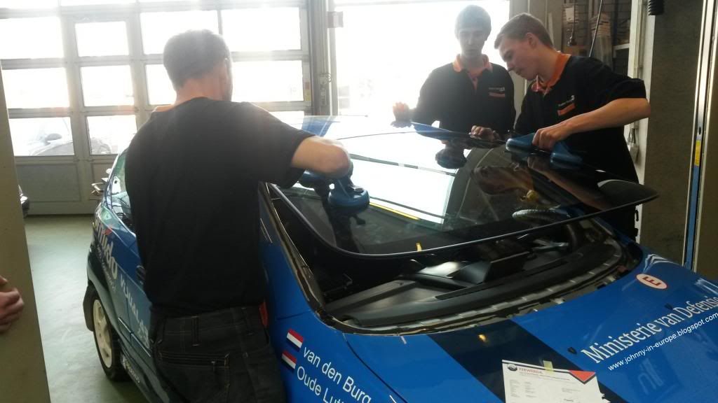 Ehdimme seurata päivän aikana myös muiden työskentelyä; lasin asennusta, pellin suoristusta, kittausta, hiontaa, jarrujen ilmausta ym.